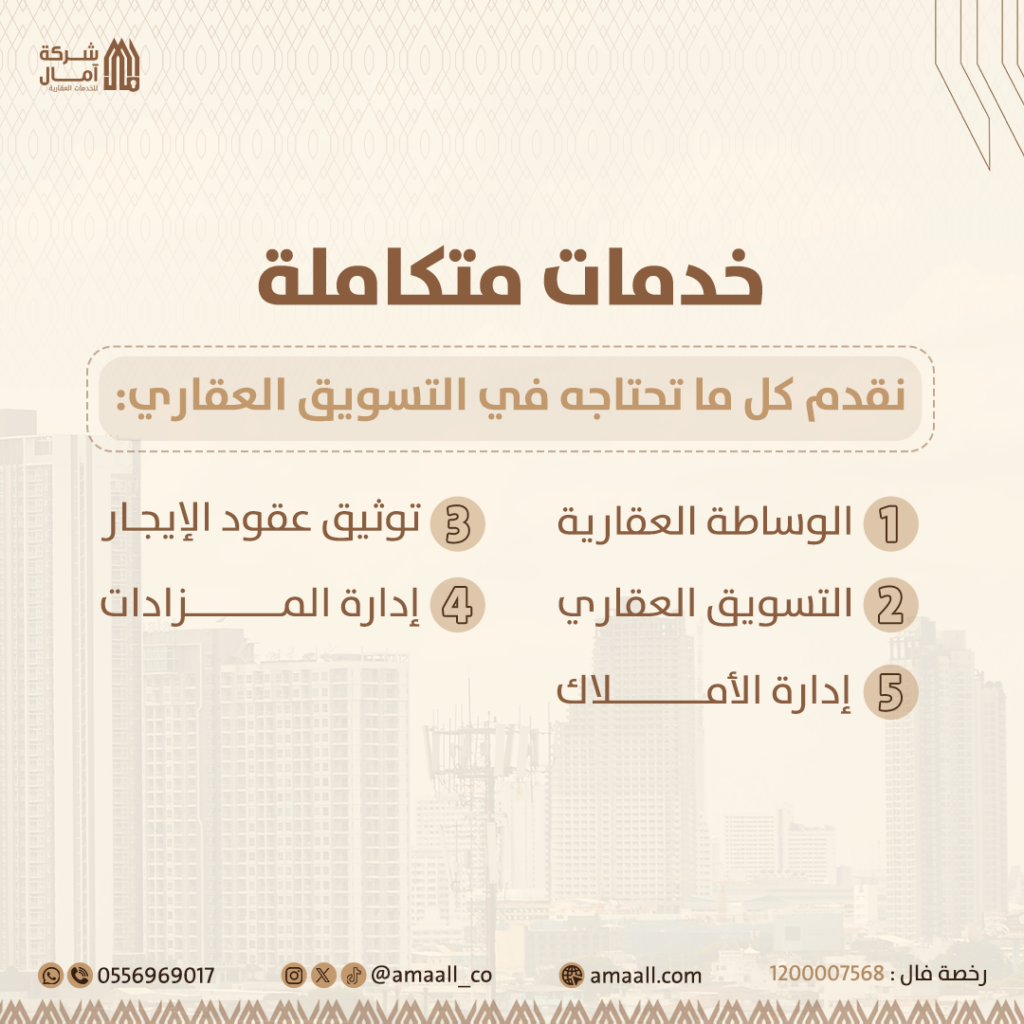 نقدم لك حزمة شاملة من الخدمات العقارية، بدءًا من التسويق العقاري المبتكر وصولًا إلى إدارة الممتلكات بشكل احترافي. كل هذه الخدمات موجهة لتسهيل تجربتك وضمان تحقيق أفضل النتائج الممكنة لعقارك.