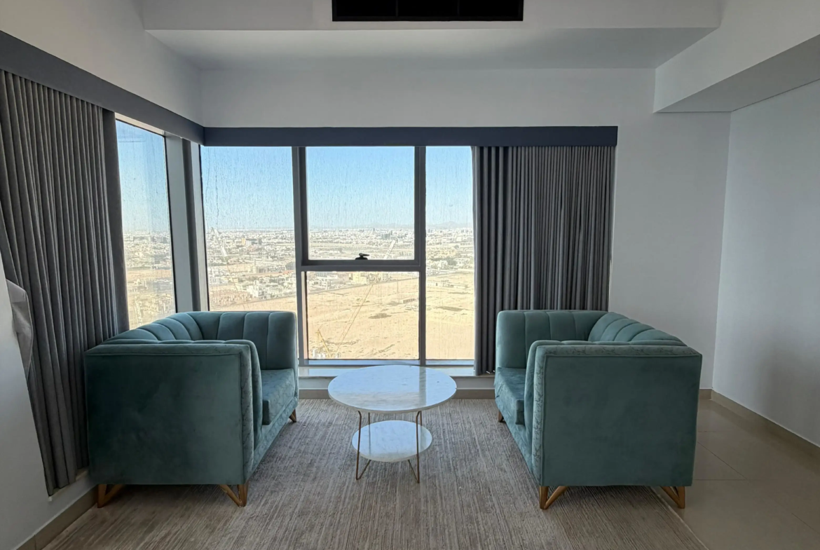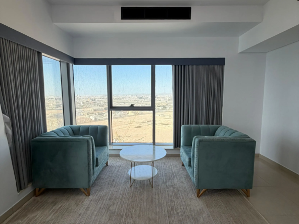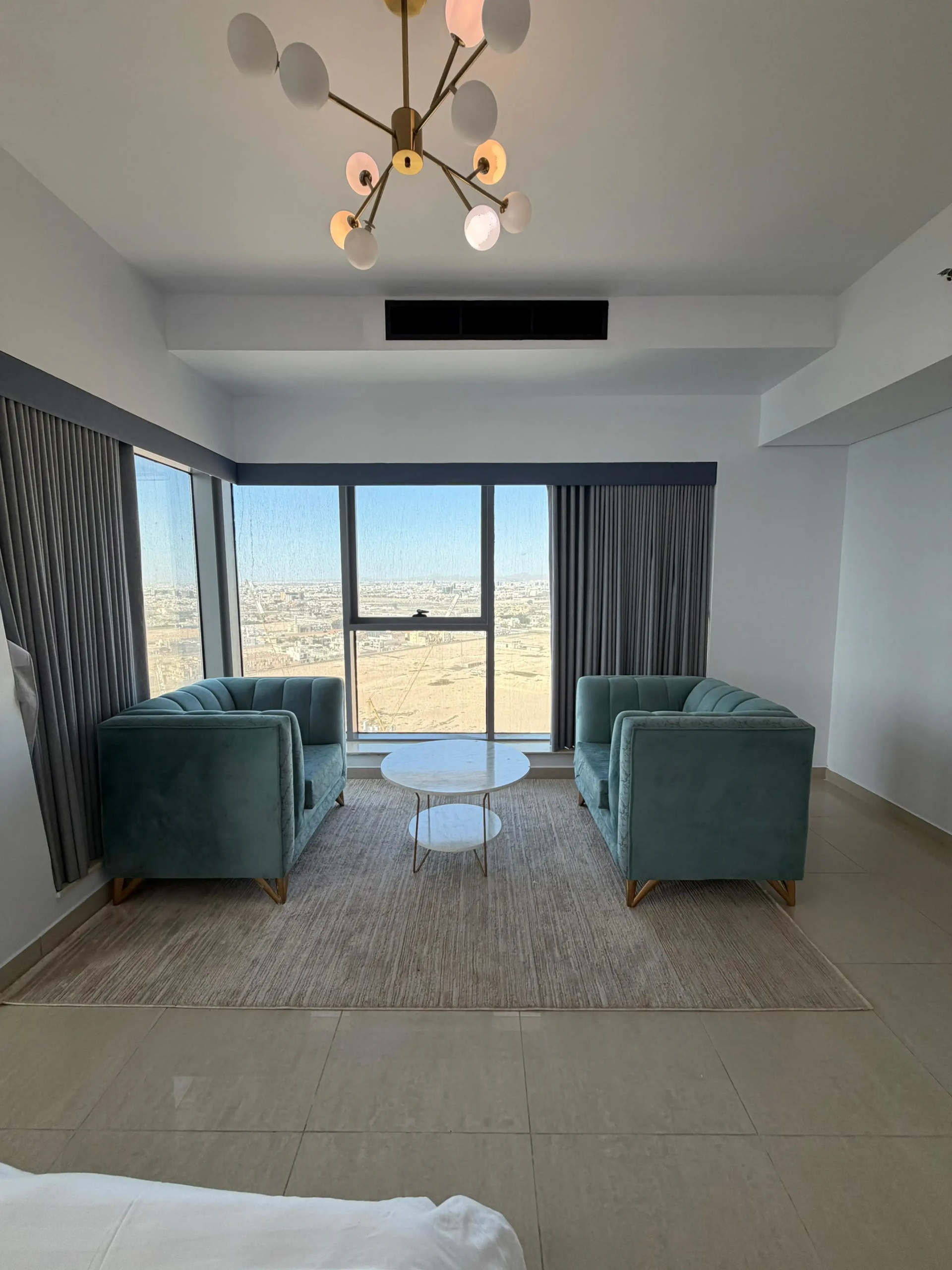 ⚫ صالة مع بلكونة بإطلالة جميلة بالإضافة الى بلكونة إضافية.